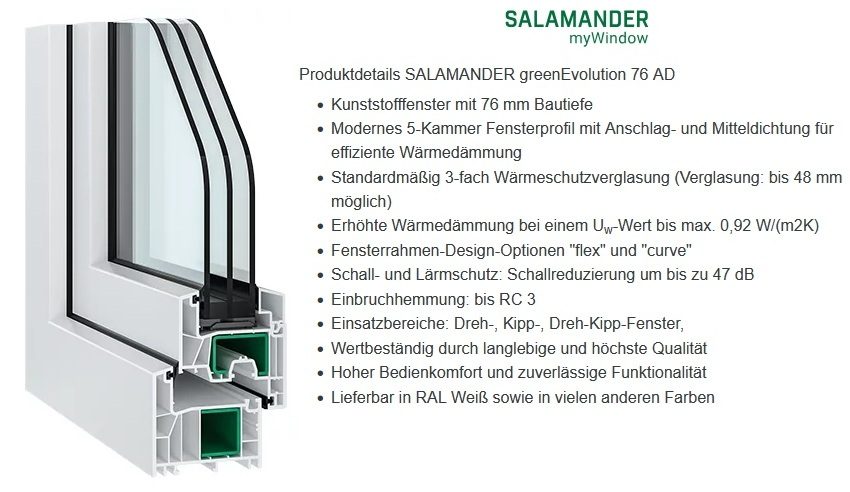 Zukunftsweisende Spitzentechnologie - das SALAMANDER greenEvolution vereint klassisches Design mit maximalen technischen Eigenschaften. Mit dem modernen 5-Kammersystem, weist das greenEvolution 76 AD Fenster aus hochwertigem Kunststoff hervorragende Wärmeschutzwerte auf.