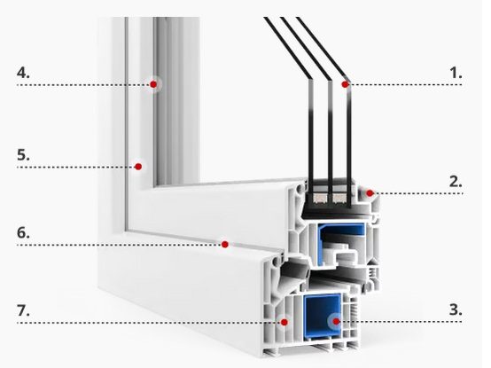 - Profilkammern: Das Kunststoffprofil ist innen in mehrere Kammern unterteilt, um eine gute Wärmedämmung zu erreichen